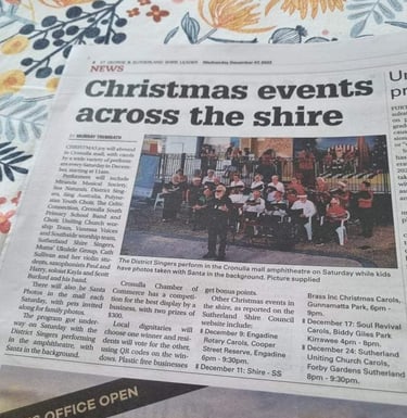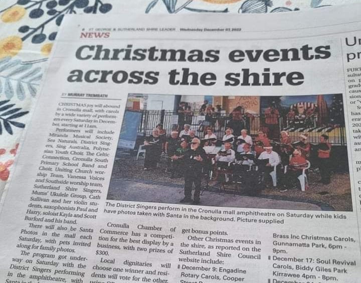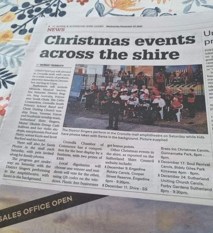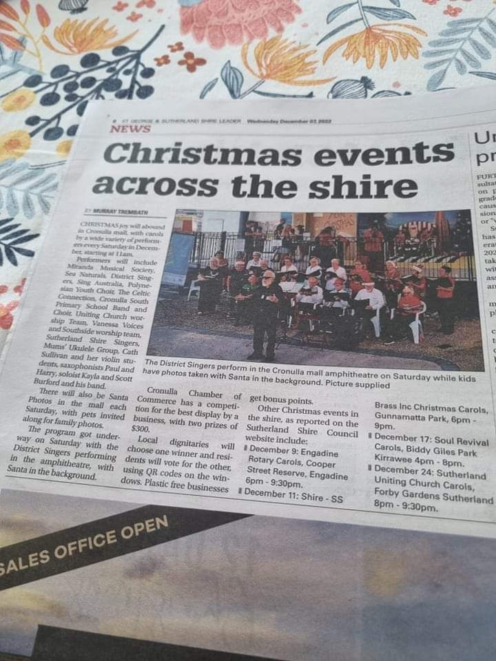 A community choir that meets every Tuesday evening during school term for rehearsals at Gymea Baptist Church, 2-10 Tea Gardens Ave Kirrawee.